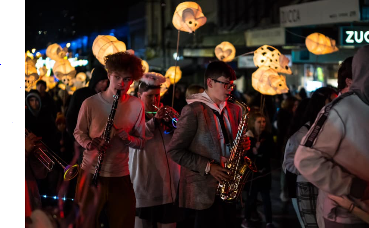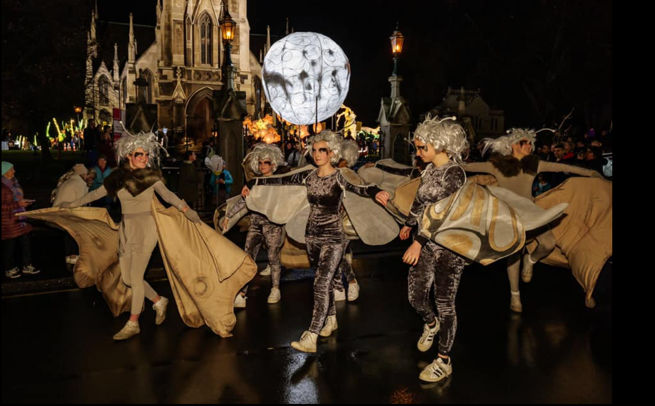 In amongst all of the above were two groups of Kavanagh College performers. The Kavanagh dancers (moths) led the parade with their amazingly beautiful and delicate wings swirling gracefully through the dark, while the Kavanagh music squad wasn’t far behind tunefully blowing trumpets, trombones, clarinets and saxophones and creating wonderful rhythms on a variety of portable percussion instruments.