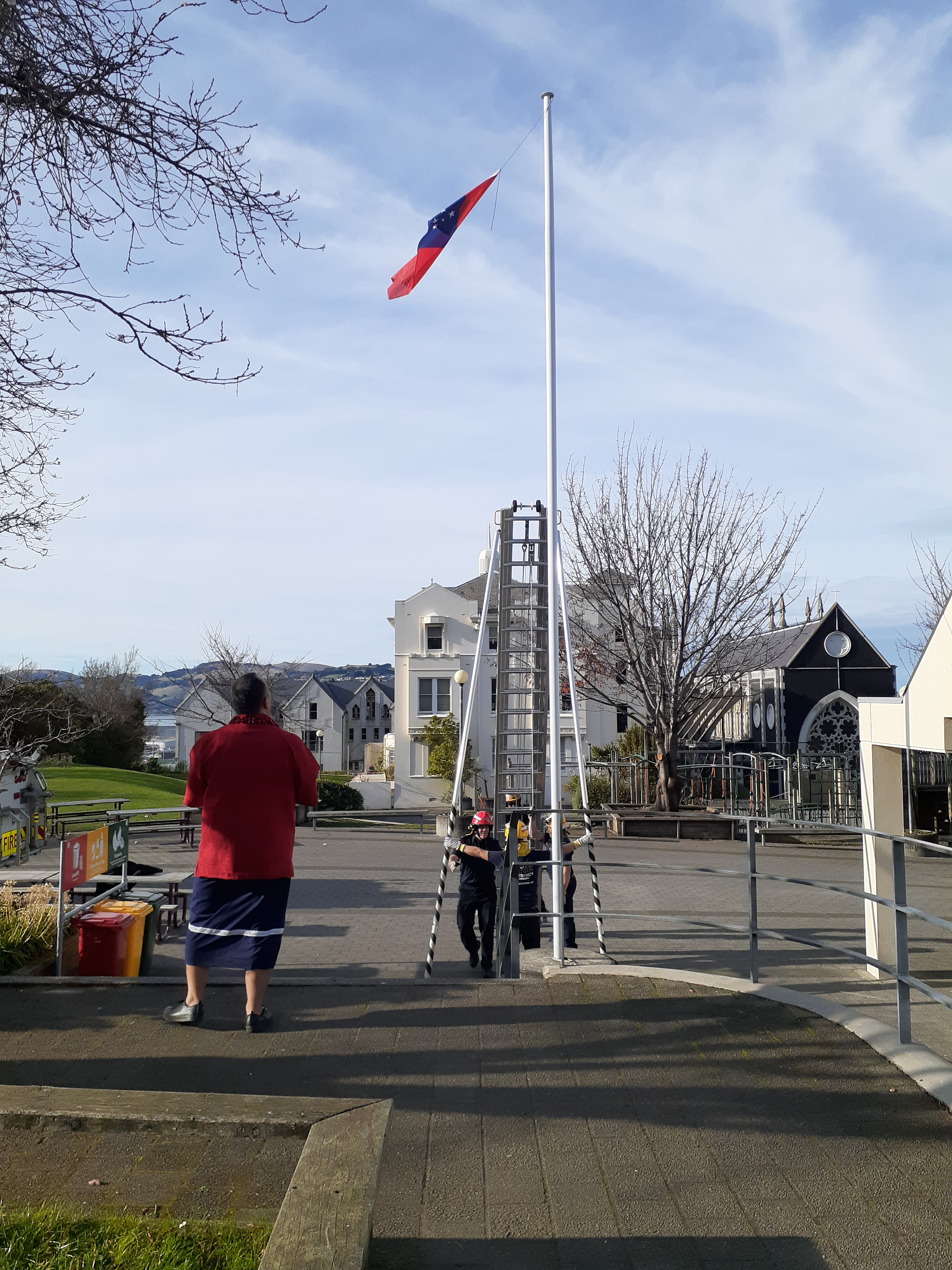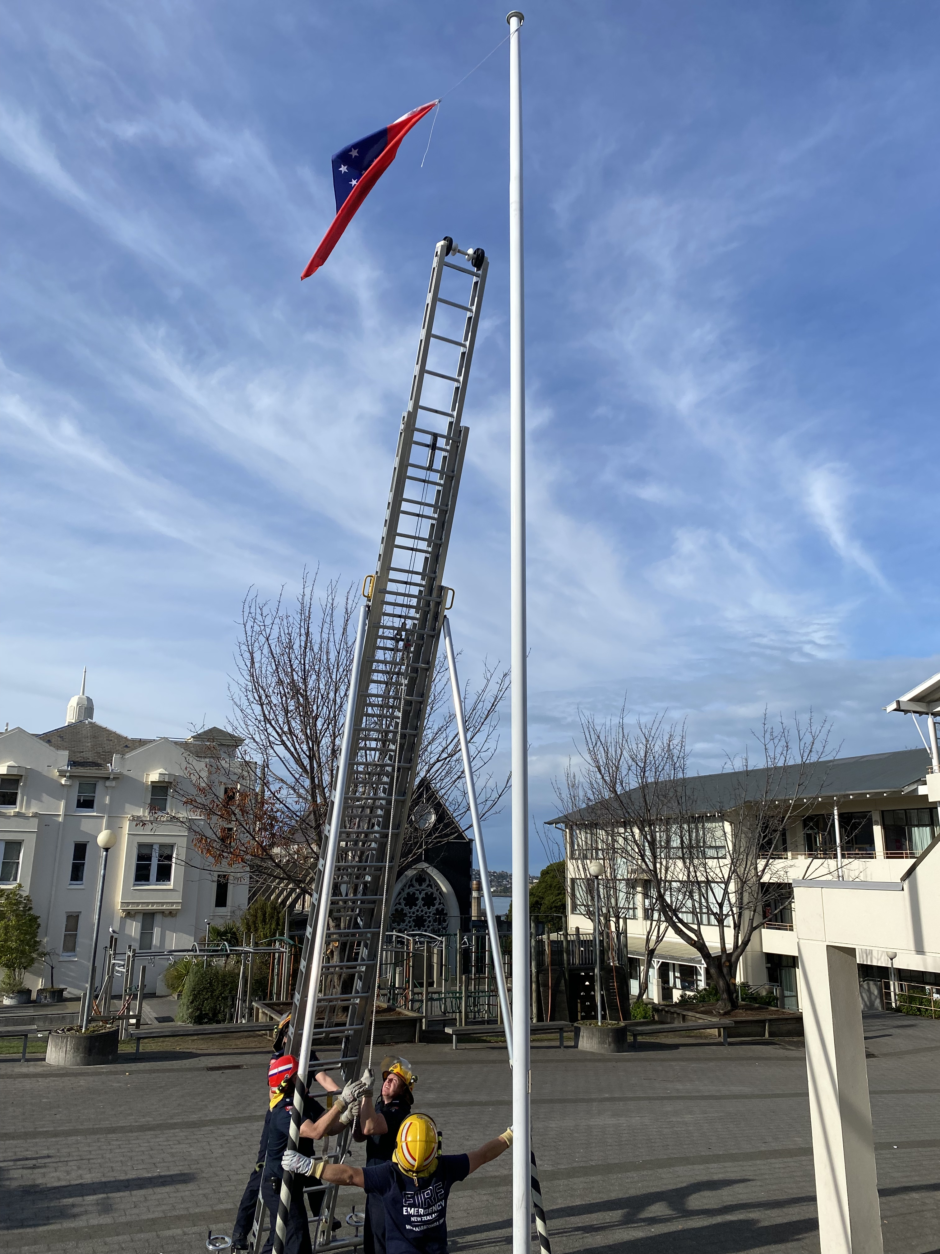 Unfortunately the flag got stuck at the top of the pole but the Central Station Fire Brigade came to the rescue this morning! Matua Tili was very happy to get his flag back.