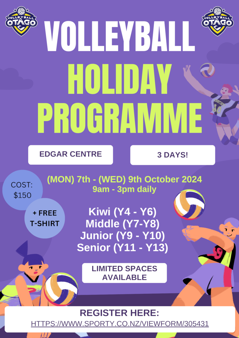 Volleyball Otago are running our very own HOLIDAY PROGRAMME during the term 3 holidays! Spaces are limited so make sure you register fast. Additional information is provided on the registration form which goes live on Tuesday 10th September and closes on Monday 30th September (see attached).