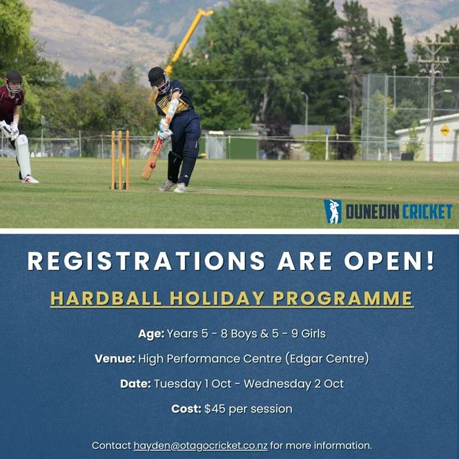 Otago Cricket are hosting a Cricket Holiday Programme for Boys (Y5 – 6 & Y7 – 8) and Girls (Y5 – 6 & Y7 – 9) these upcoming holidays! Our Hardball Holiday Programme targets players who: