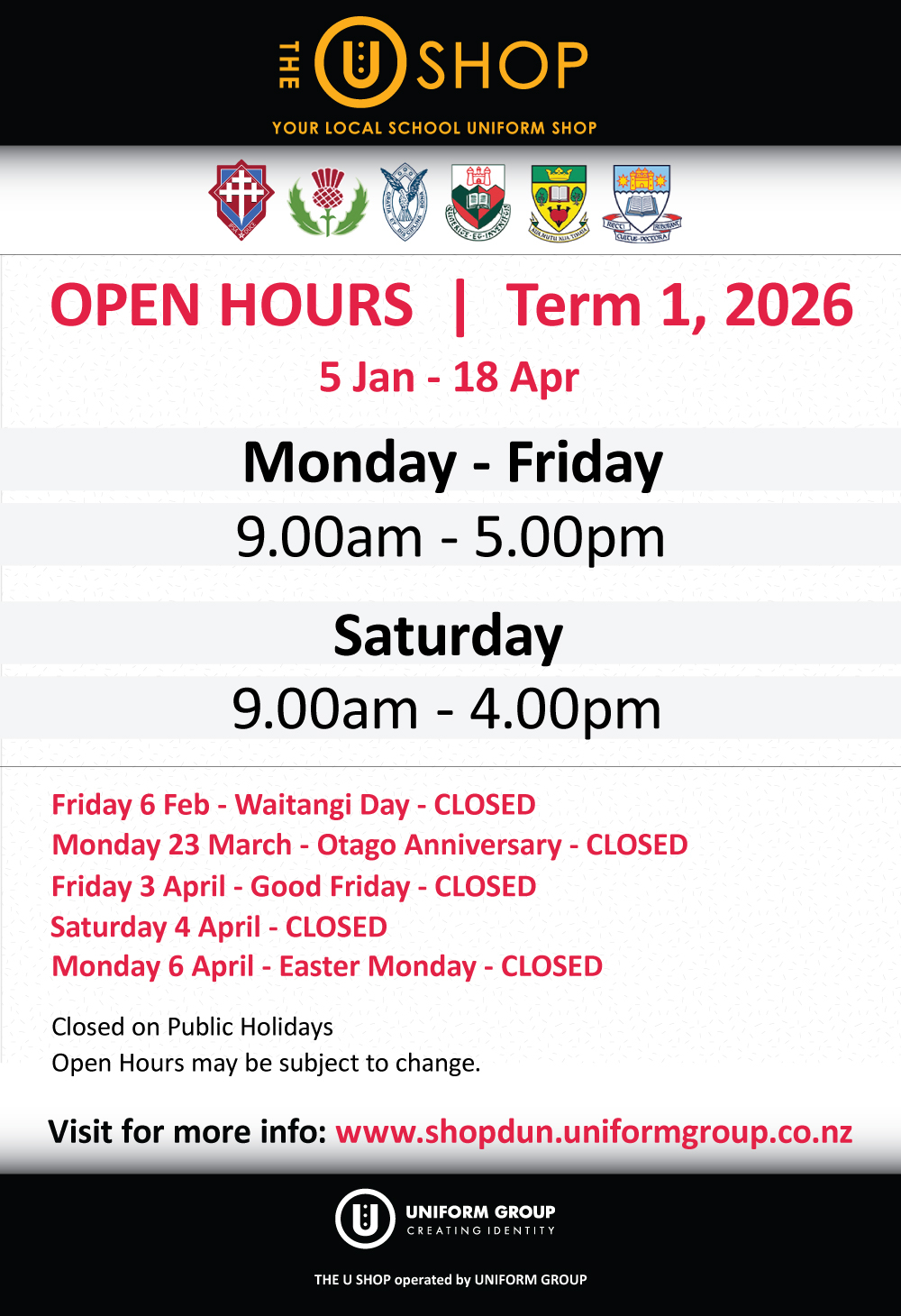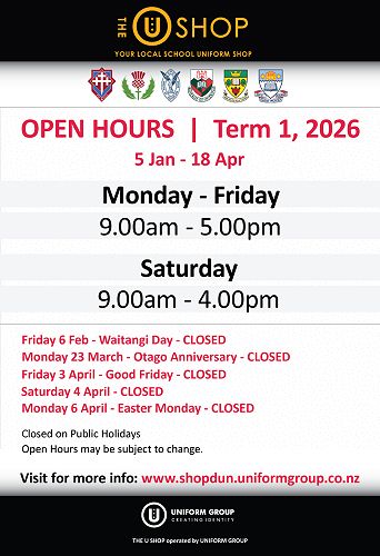 Please find attached our Shop Opening Hours during Summer Holidays and Term 1, 2026.