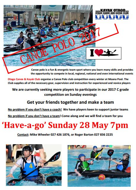 The Otago Canoe and Kayak Club is having a canoe polo have-a-go skills night on 28 May at 7pm at Moana Pool so turn up and see if you would like to be involved in Sunday evening competitions