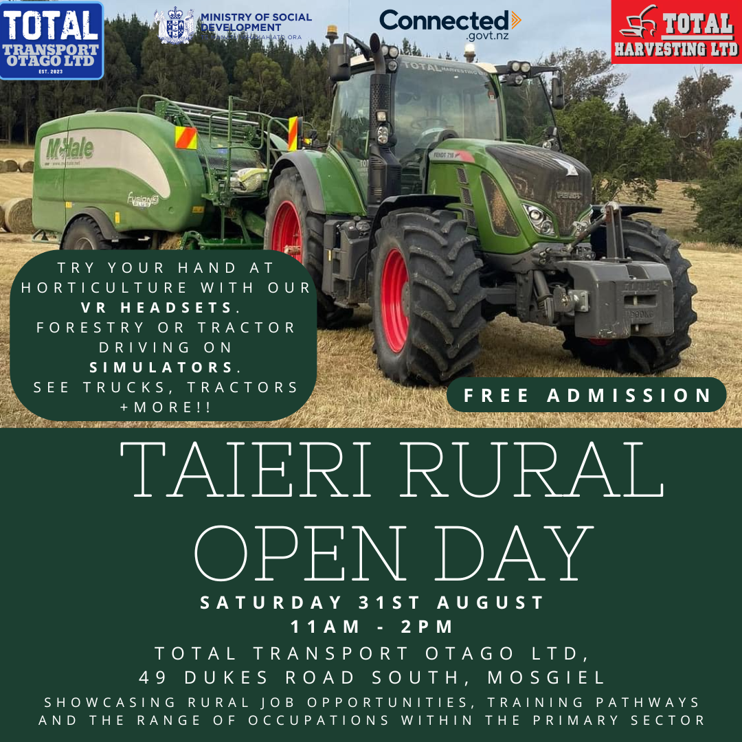 We invite yourself, staff and students along to the Taieri Rural Open Day this Saturday 31st August 11am – 2.00pm