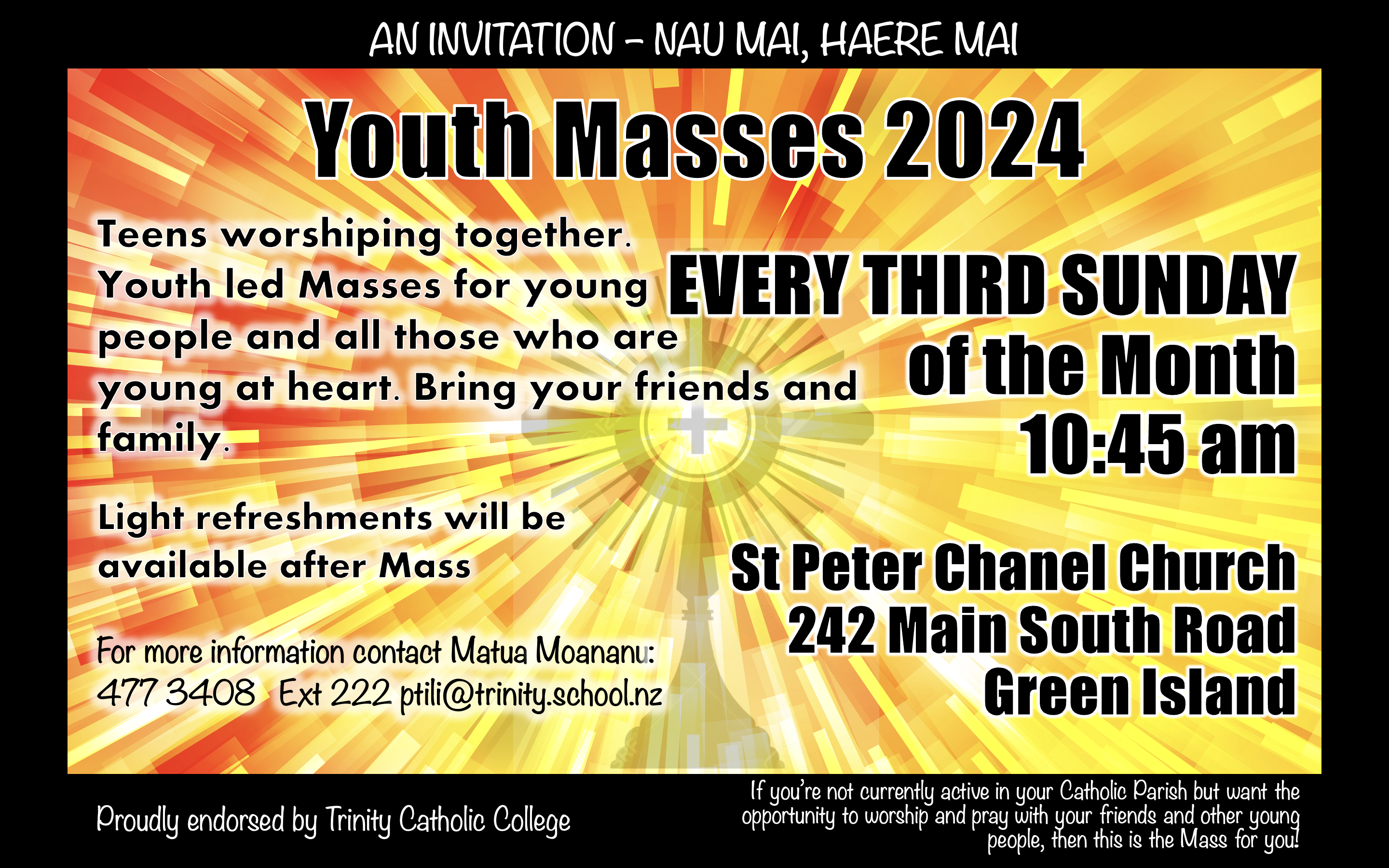 This Sunday at St Peter Chanel Church in Green Island we will be having a Youth Mass. This is a Mass that encourages young people to connect with a local parish community, and it is an opportunity for young people to be involved with our church. I hope to see some of you there and hopefully you will stay for a sweet treat afterward!