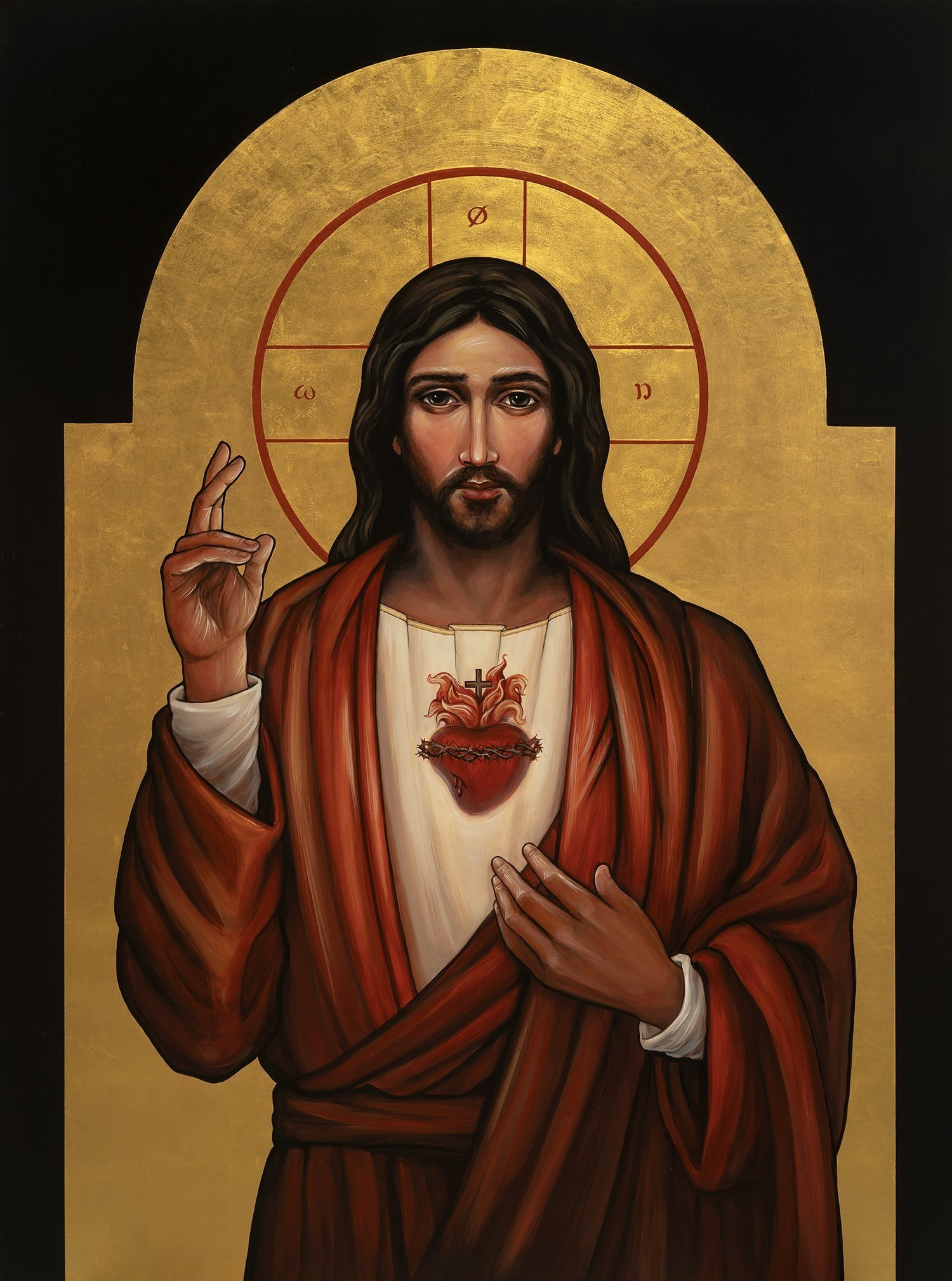 The Heart itself is the symbolic center of feeling and emotion, and it represents Jesus’ deep love and affection for us. It is sometimes shown by itself, but often with an image of Jesus, and then above his chest. Most frequently it is depicted as red, the color of blood, which Jesus poured out for us (Jn 19:34).