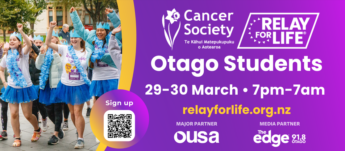 We are really excited to announce the Relay For Life Otago Students is back for another year on University of Otago campus! The event will be the 7pm – 7am Saturday 29 - 30 March 2025.