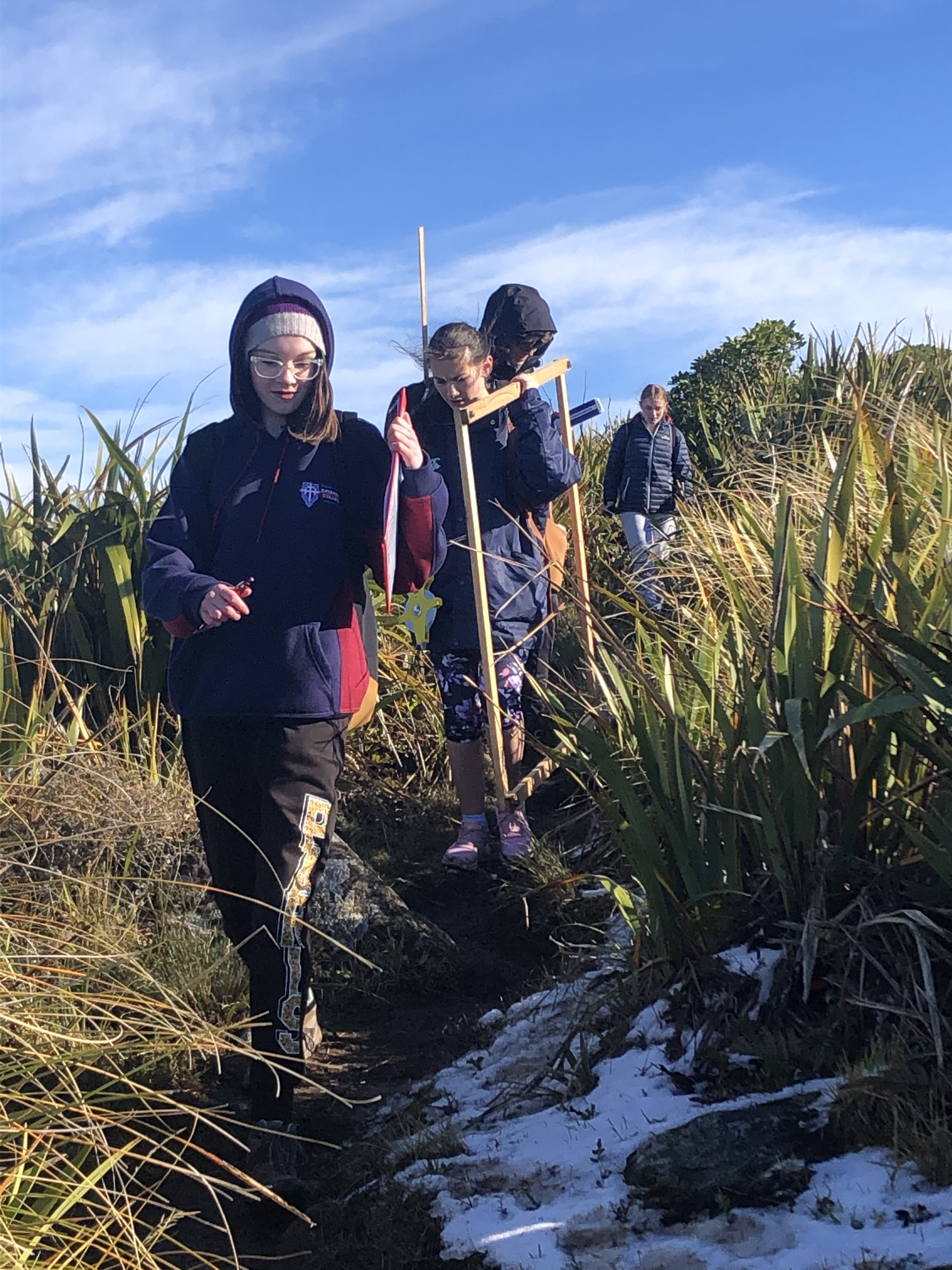 The conditions were a little challenging to say the least - gale force winds; a little ice and snow on the ground and one very steep hill! However, the kids were amazing and they worked hard, with good spirit, to collect data on the species composition of plants in an alpine area. While a little tough, we saw some native birds and were rewarded with great views along the way.