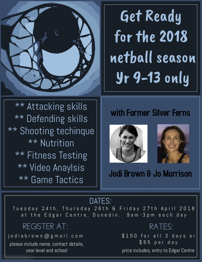 A school holiday netball programme is being run by Jodi Brown and Jo Morrison over 3 days at the Edgar Centre. See flyer attached for more details and to register.