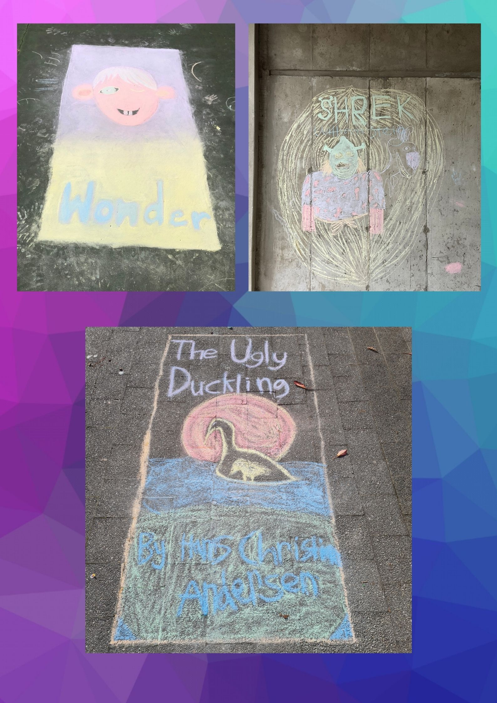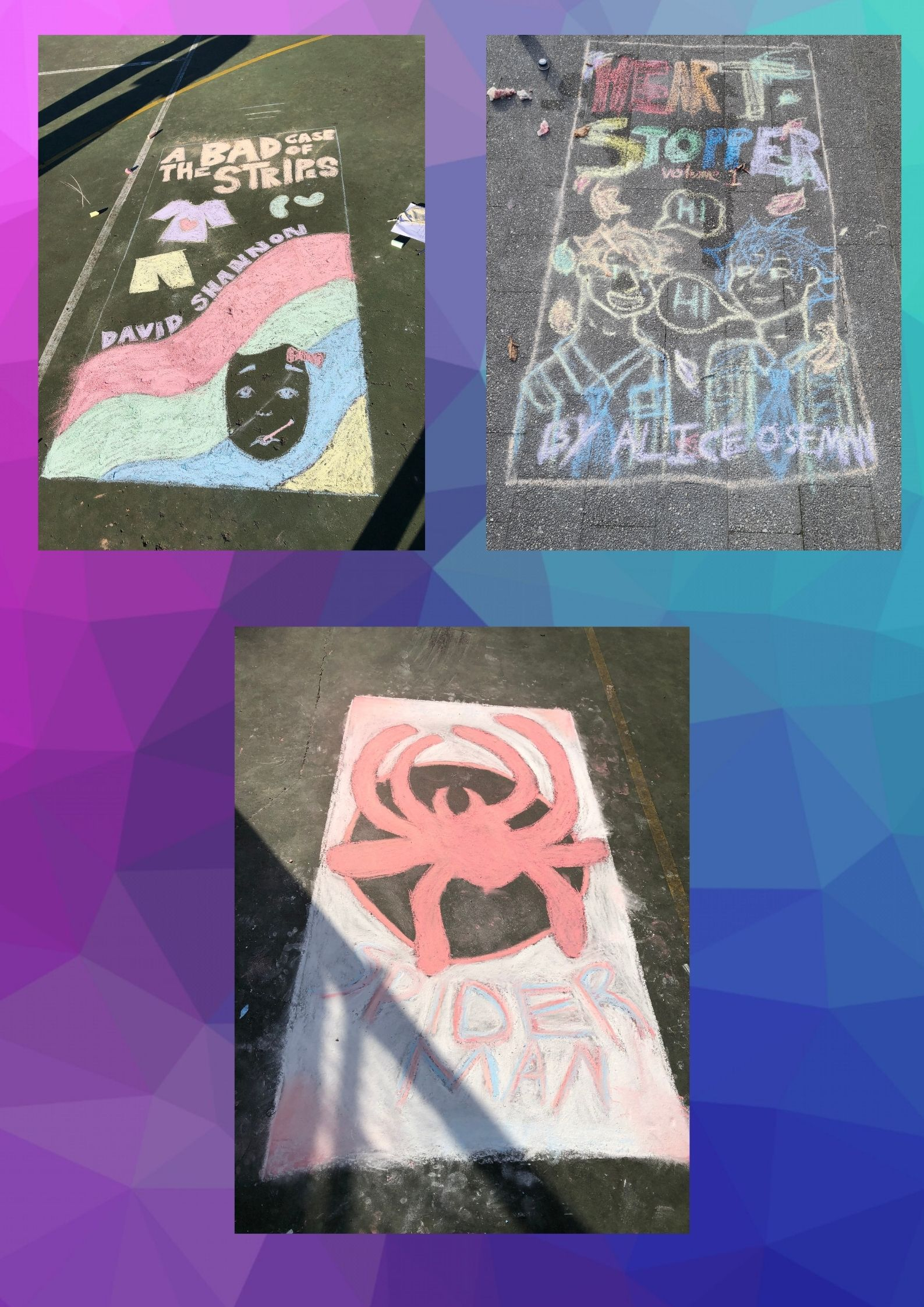 As part of Book Week Te Timatanga took part in a range of challenges in class. They had reading challenges, quizzes, and students had to work with peers to redesign a book cover using chalk art. For the redesign and book cover, students worked together to decide which book to use and plan a static image for that book. They had to consider the dominant image, use of space, use of colour and font. Look below for examples of the spectacular creations of our talented students.