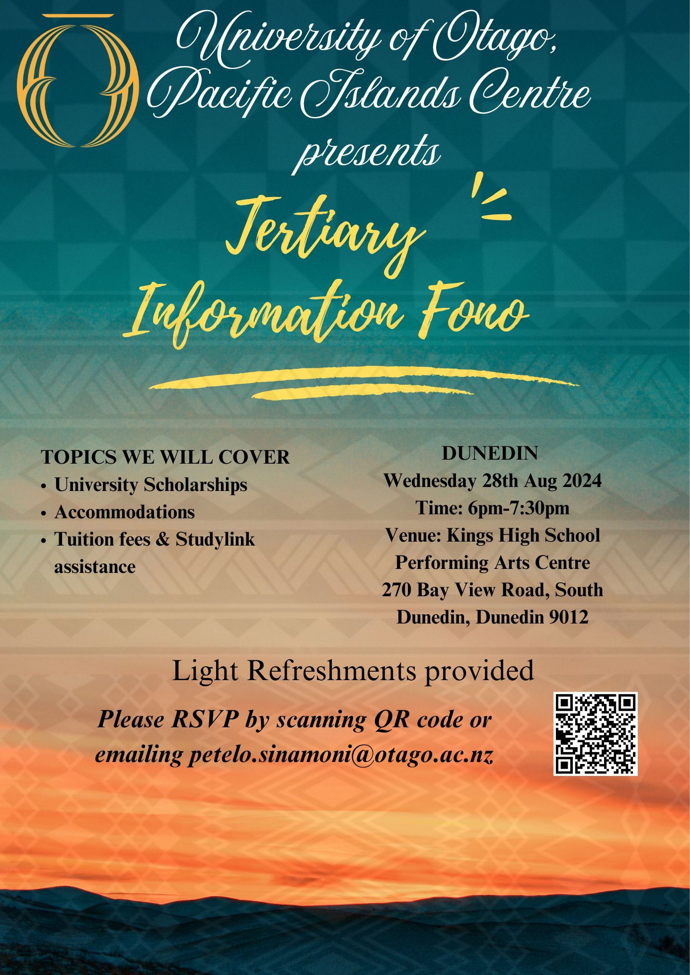 The University of Otago Pacific Islands Centre extends a warm invitation to attend their upcoming Tertiary information evening.
