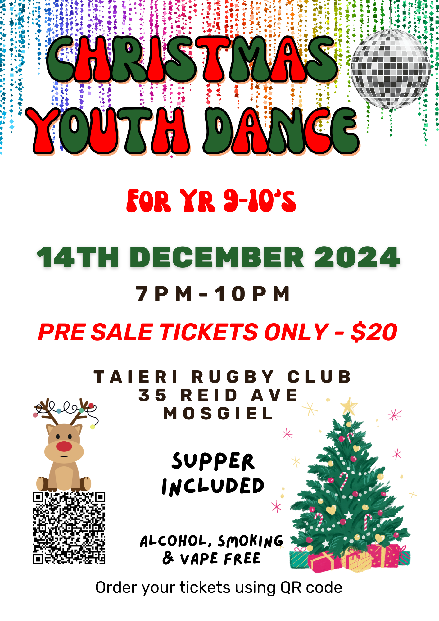 The Taieri Network is hosting a Christmas Youth Dance for Year 9 & 10 Students, Saturday 14 December 2024.