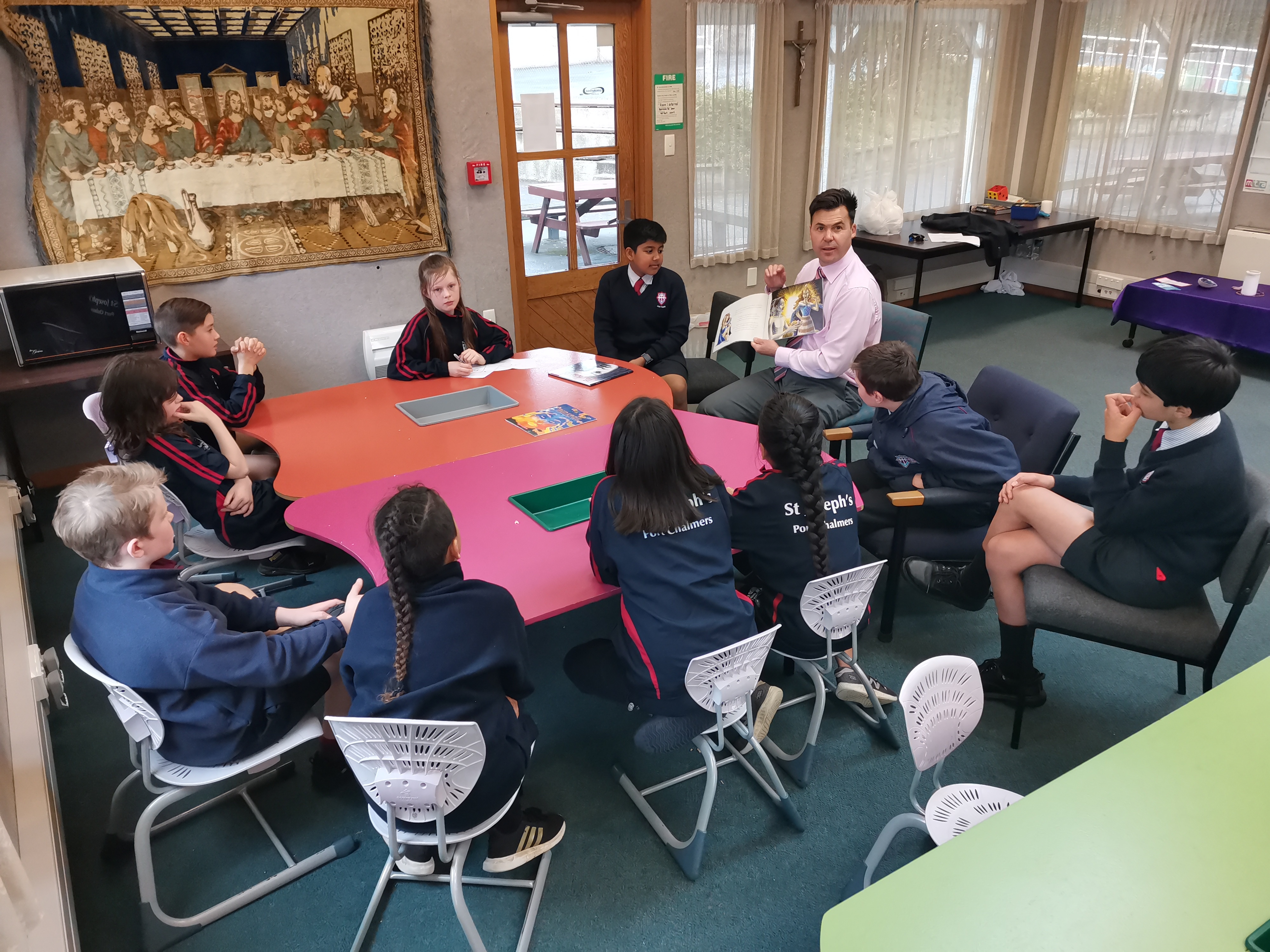 Last Friday Kavanagh College visited St Joseph's Port Chalmers School that is located next to St Mary, Star of the Sea. This Church was built in 1881 and you can feel the history as you walk onto the school site. After a warm welcome from principal, Mr Tom Woodhouse and the entire school, our students began the story session. Year 7 students Riley Matthews, Noah Breese, Jay Morey, Maddy Muschamp, Akein Wickramagedara and Isla Simonsen were fantastic ambassadors for the college.