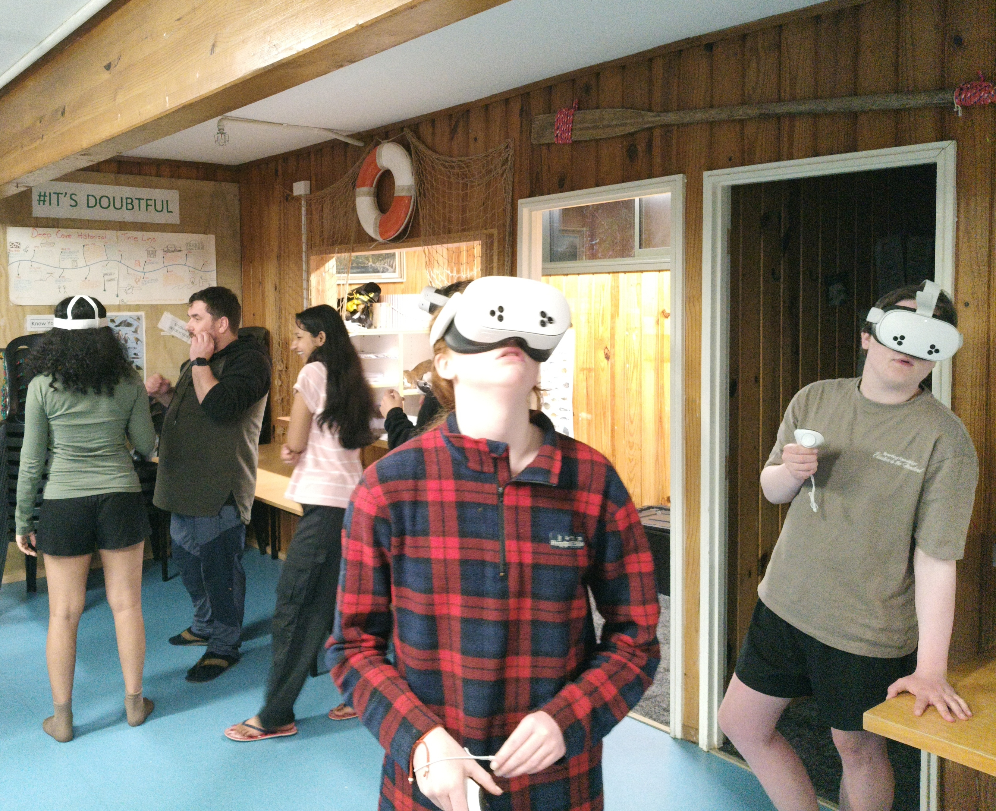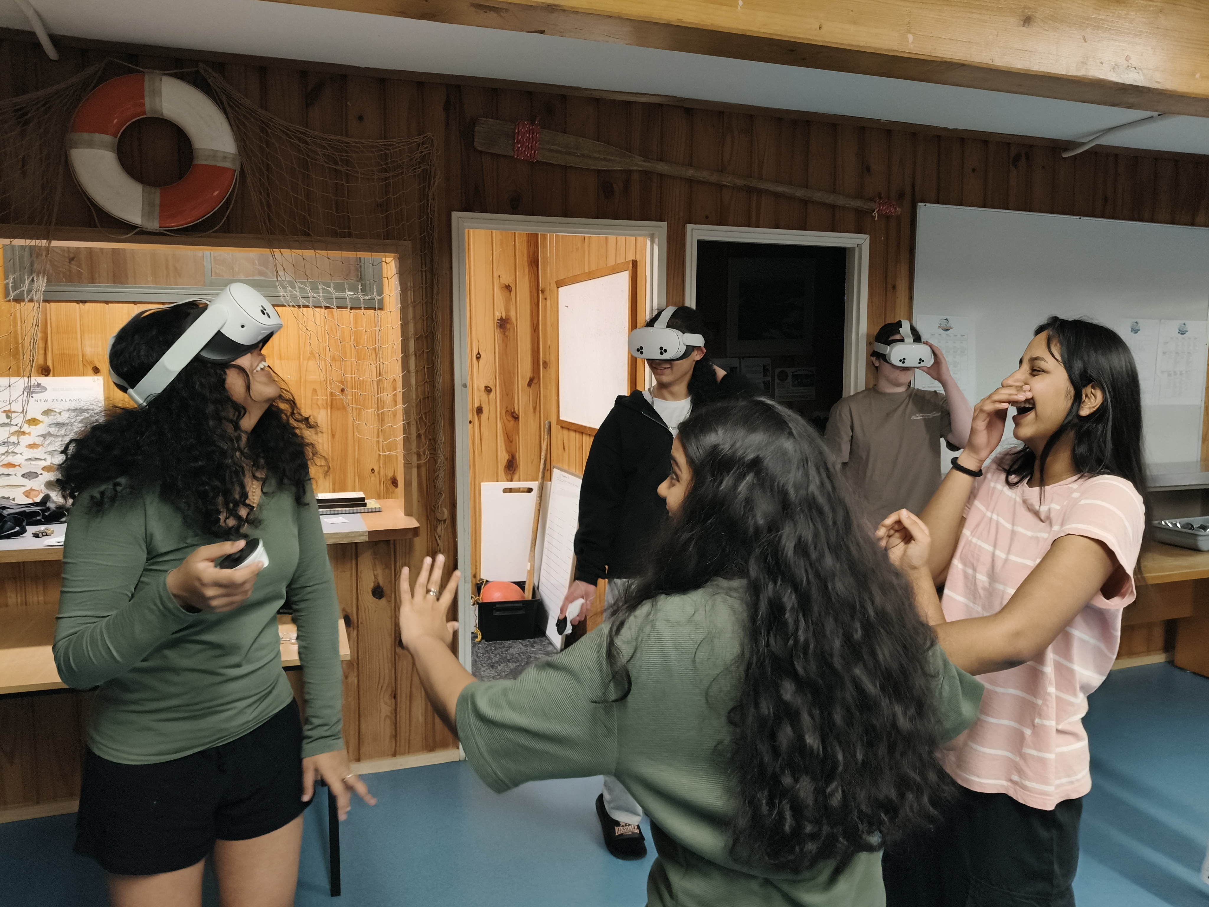 The camp features a number of fishing competitions. Ollie Muschamp holds the ‘All Time Award’ for most fish caught (117, 2024). Devan Black received the ‘Golden Hook Award’ for most fish caught on the 2025 camp which was 34. Devan and Eli Bungard this year share the ‘Moby Dick Award’ for the largest fish caught on the which as you now know was the enormous seven-giller! As the heavy rain became heavier on Thursday morning, long-time manager and legend Billy Williams advise us that some important people would soon be arriving. As we were about to leave for a morning stroll, MP for Invercargill and Minister for the Environment, Hon Penny Simmonds, local iwi and the Fiordland Marine Guardians popped in and dropped off six VR headsets. These headsets have been donated by Fiordland Marine Guardians. The amazing 'diving' experience takes you through the pristine waterways looking at kōura moana/spiny red rock lobster, black coral and meeting university researchers who work in this unique and precious marine environment. Maryann Vishal, Andre Bell, Skylah Knopp and Ryley Prasad thought the VR experience was "very cool." After singing 'Ka Waiata' to express our gartitude, we departed the hostel and spent the next few hours getting wet.