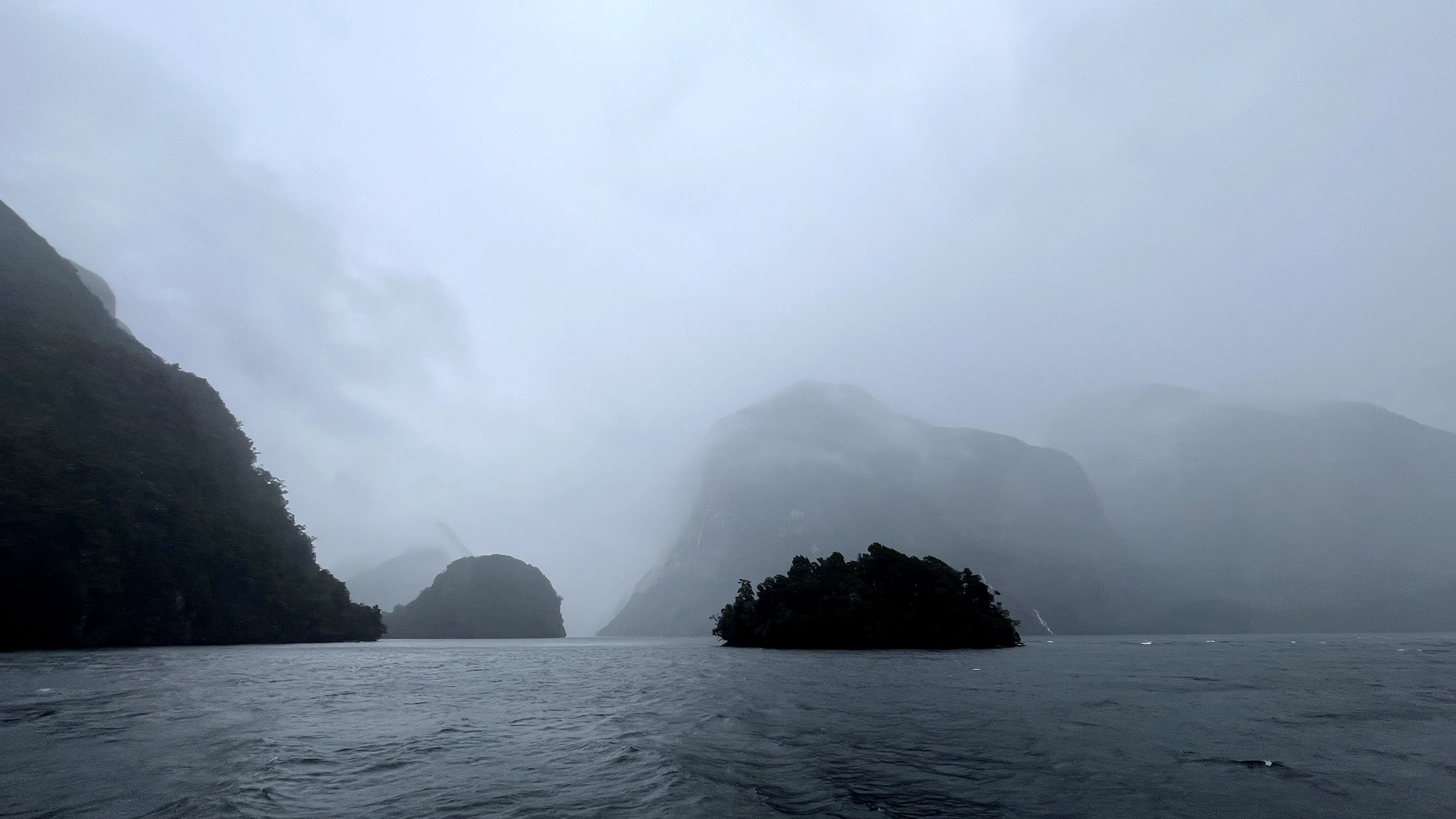 It’s about six hours from the dungeon at Trinity Catholic College to the hostel at Deep Cove which involves van, boat and coach travel. Fiordland is a wild and striking place that has been sculpted by glaciers with the Ōtira Glaciation period finishing about 20,000 years ago. According to Ngāi Tahu oral histories, Fiordland was created when the demi-god, Tū-te-Rakiwhanoa, hewed the rough gashes of the southern fiords around Rakituma/Preservation Inlet and Tamatea/Dusky Sound, leaving Resolution and Secretary Islands where his feet stood. He honed his skill as he worked north, reaching perfection with the more defined Milford Sound (Piopiotahi). After creating this spectacular landscape, he was visited by Te-Hine-nui-te-pō, Goddess of Death, who feared the vista created by Tū was so wonderful that people would want to live here forever. To remind humans of their mortality, she freed namu (sandflies), at Te Namu-a-Te-Hine-nui-te-po (Sandfly Point), at the end of the Milford Track.