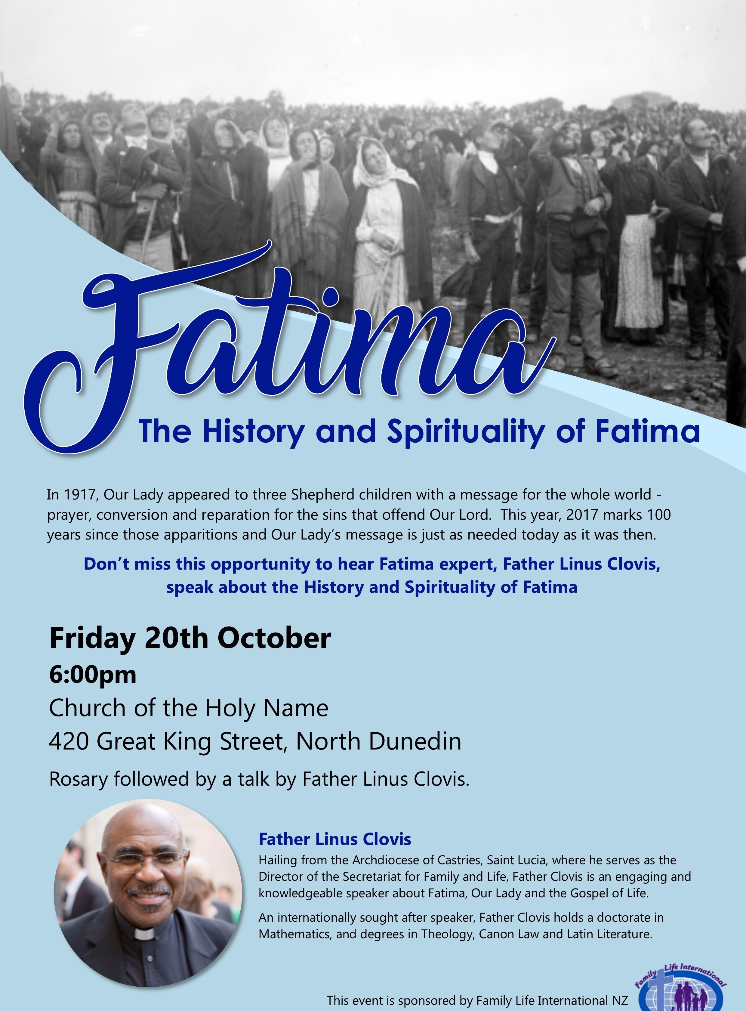 To celebrate the 100th Anniversary of the Miracle of the Sun we are lucky to have Fr Clovis visiting Dunedin to give a public talk at St Francis Xavier and a talk to students at Holy Name.