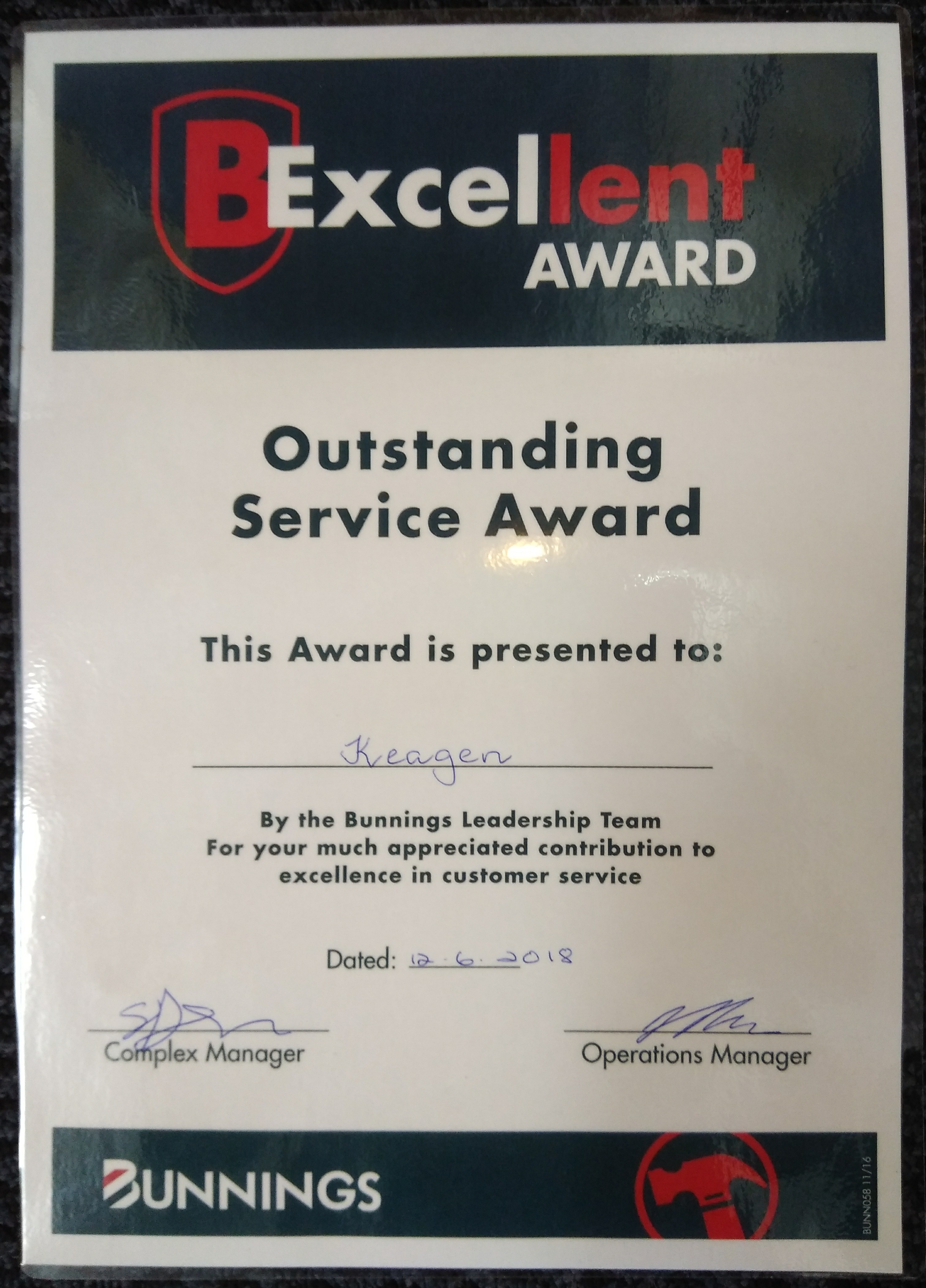 Congratulations to ex student Keagen Kirk who was awarded an Outstanding Service Award by the Bunnings Leadership Team