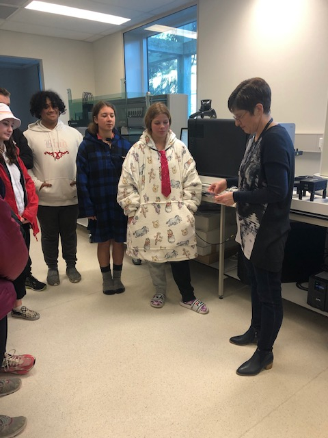 Anne-Marie Wells explained how the farm operated and then gave the students a tour of the farm in including the rotary milking shed. The focus for the trip was future proofing strategies required in agribusinesses. After a relaxing picnic lunch the students were welcomed into the lab at GenomNZ (NZ Animal DNA Genotyping Cattle Sheep). This was fascinating to see how the testing is carried out. See www.agresearch.co.nz if you wish to take a look at this interesting business.