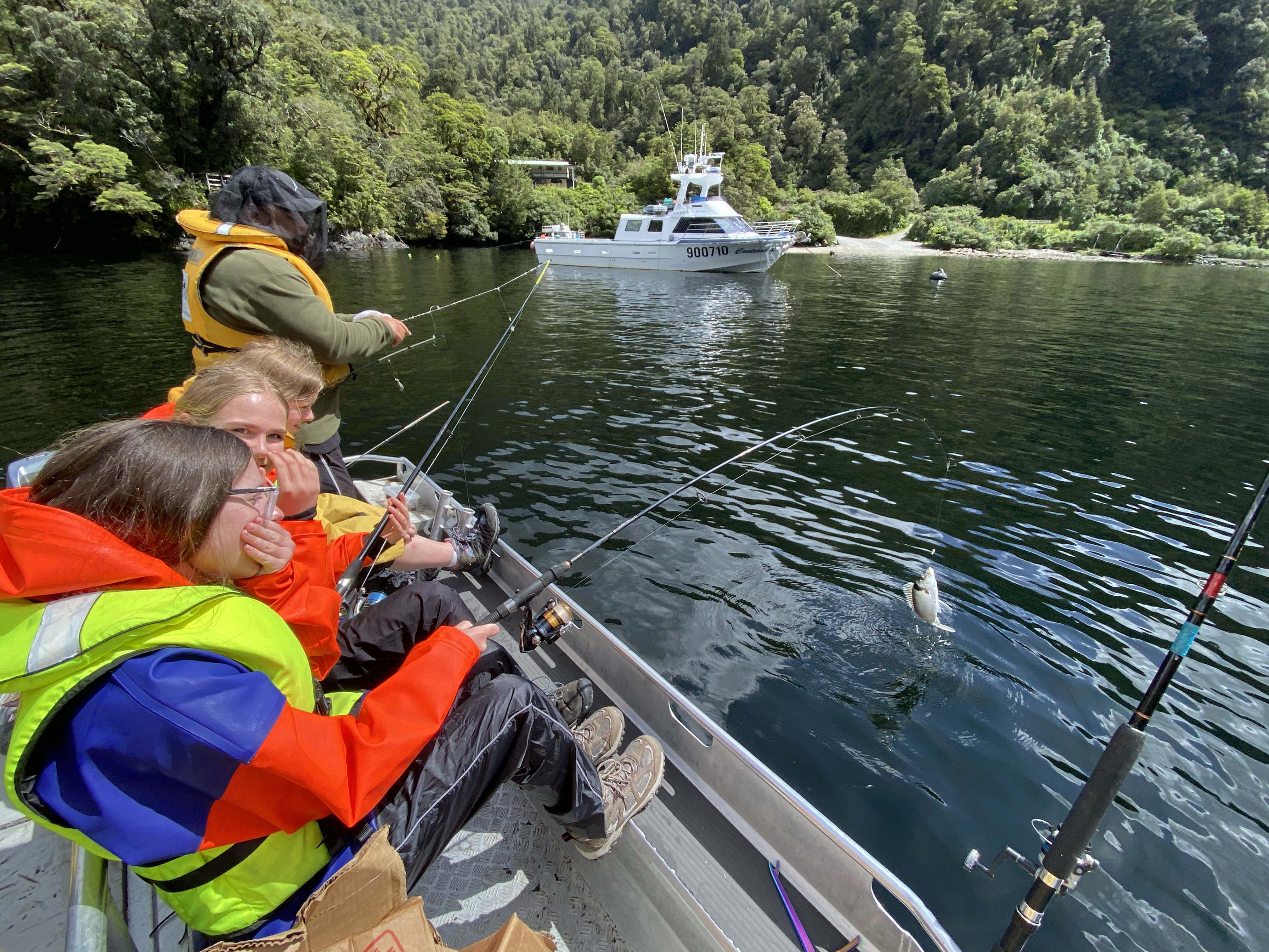 Did you know that Doubtful Sound was originally named 'Doubtful Harbour' in 1770 by Captain James Cook as he did not enter the inlet as he was uncertain whether it was navigable under sail. It was later renamed Doubtful Sound by whalers and sealers, although it is not technically a sound but a fiord. U-shaped valleys that have been sculpted by ancient glaciers dominate the local landscape. The fiords that give this corner of New Zealand its name is also teeming with marine life and we have been lucky this week. From Gurnard, Dogfish Sharks, Blue Cod, Jock Stewarts (Sea Perch) to Grouper and Shark we have enjoyed baiting, casting and catching plenty of fish. As part of the camp package, the school hostel provides two 14-foot Stabicraft fizz boats.