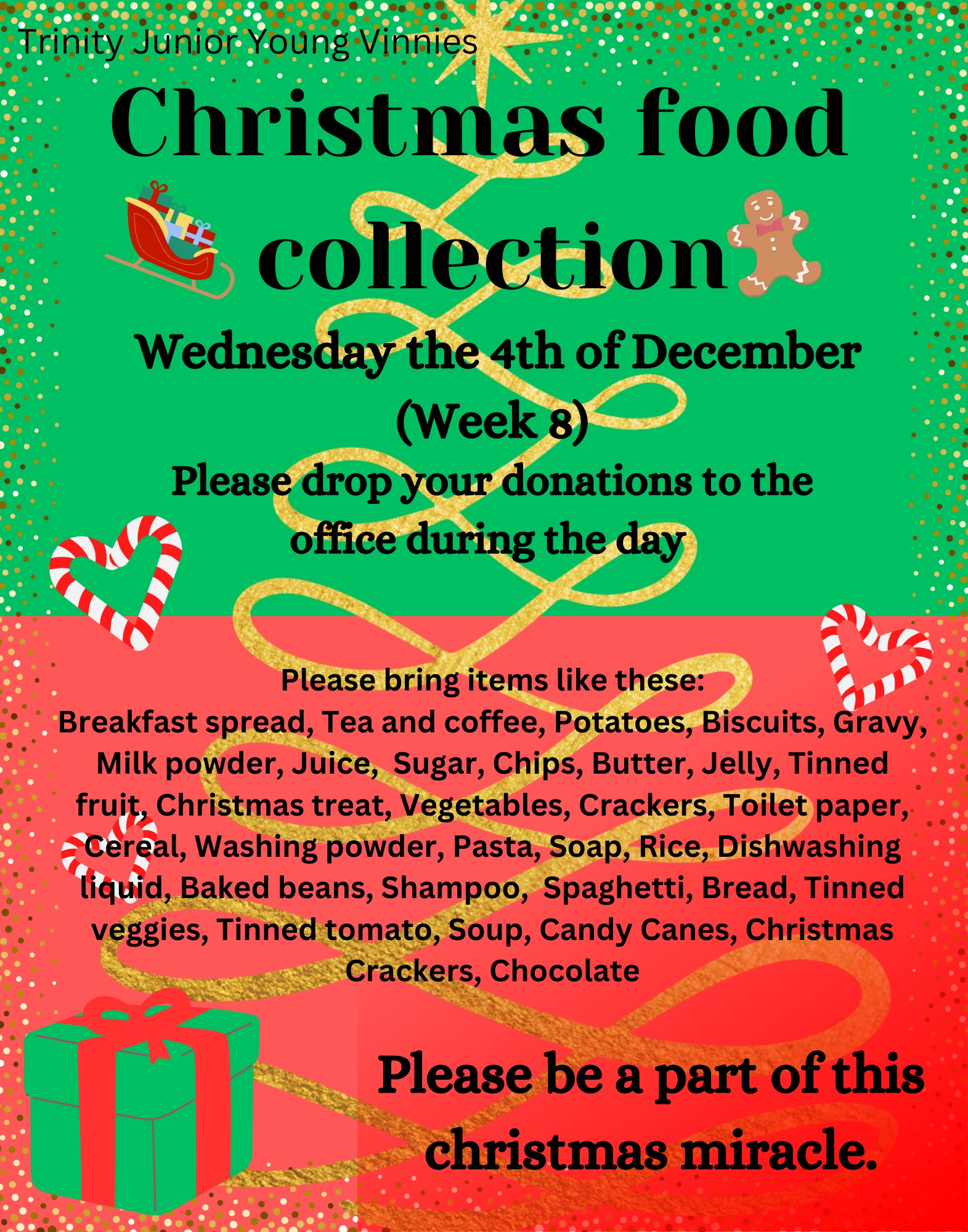 The Junior Young Vinnies Group is doing a Christmas food collection in the School Office on Wednesday 4 December (Week 8). Please bring along canned goods or other Christmas items if you’re able to.