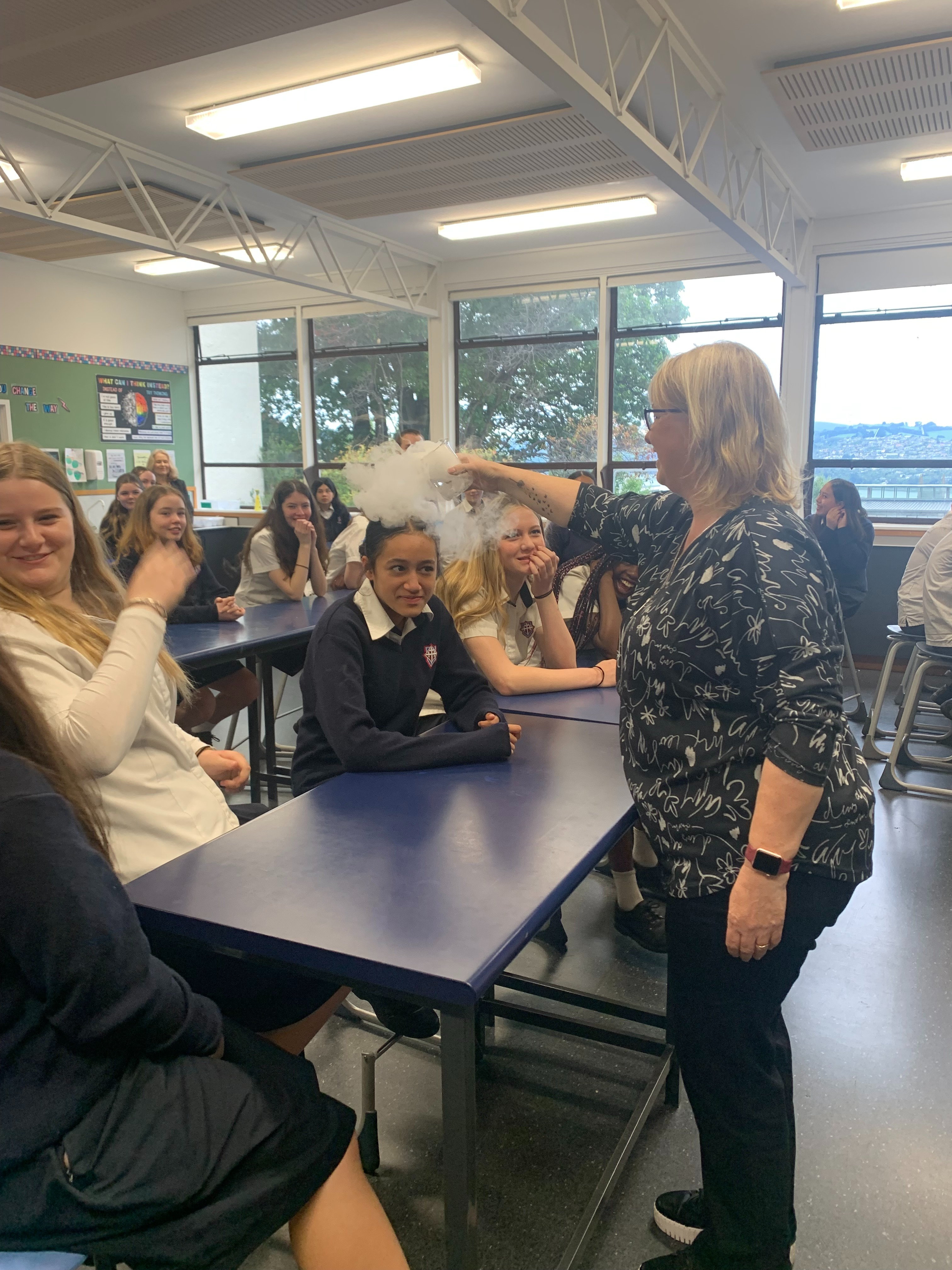 Year 9 students had a great time consolidating their learning on state changes and sublimation, with experiments conducted by Mrs Thompson and Ms. Cooney using dry ice. Dry Ice quickly changed from solid to gas with the addition of warm water. Gas, not water, flowed over willing participants' heads, in a 'trust' exercise, including Mrs Tili's!
