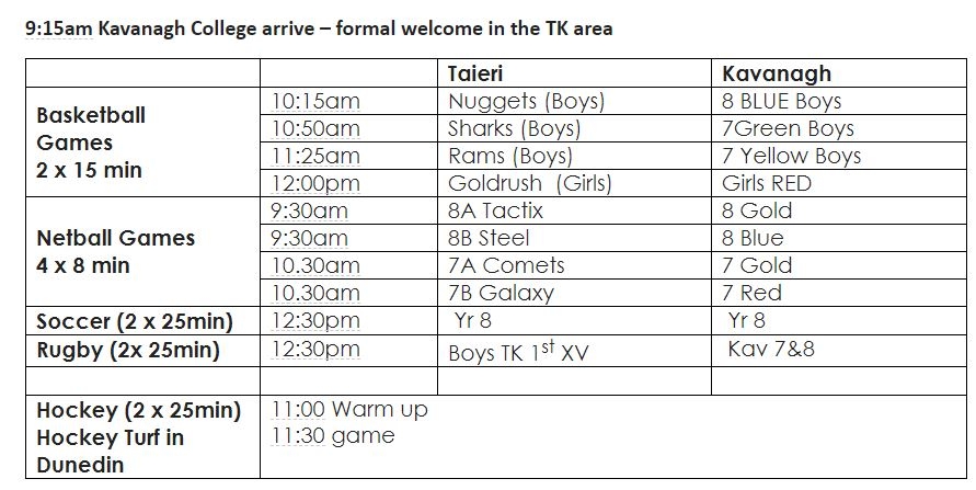 · Years 7&8 Hockey (This will be held at the Otago Hockey Turf for the first time. Minivans will be provided to this match. More info will follow for these players)