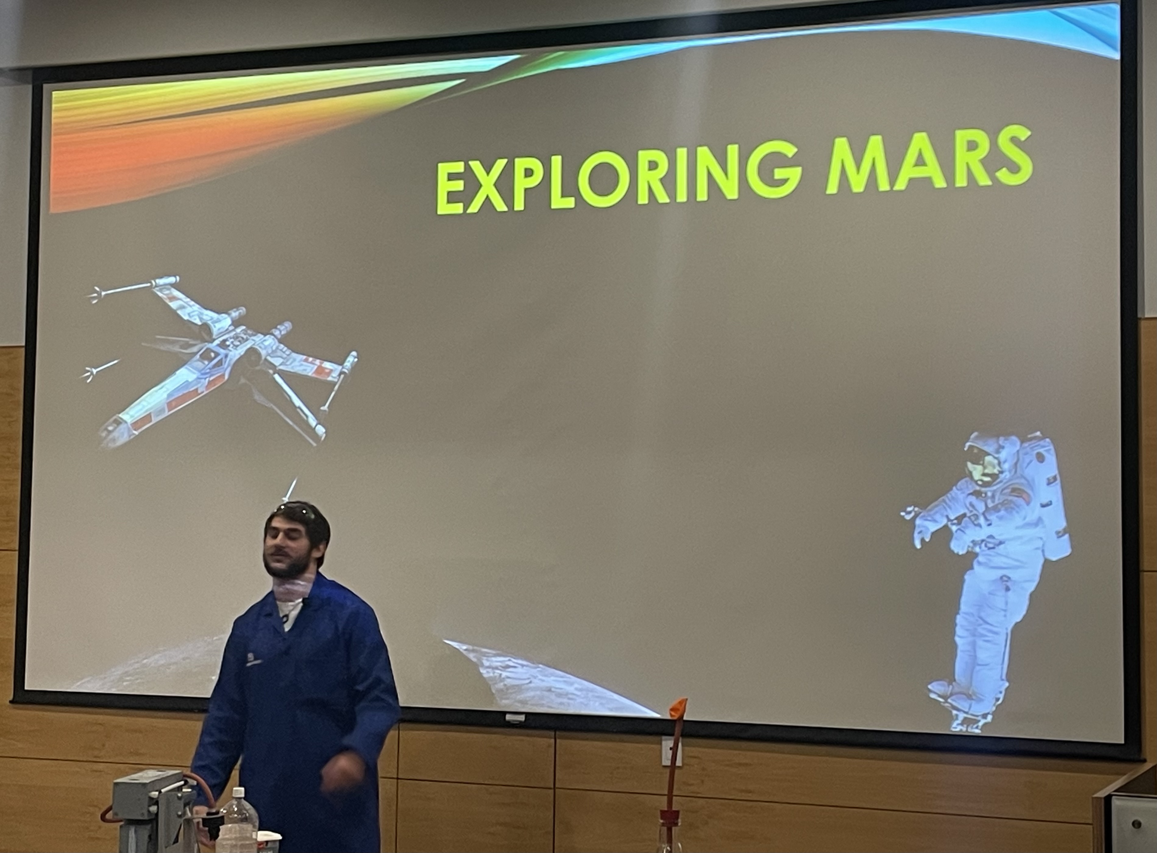 In the Lecture Theatre, we were told about Mars’s low gravity and that you don't need much thrust to exit Mars’s orbit. You would only need a bike and a ramp (and of course a space suit) to exit the orbit of Mars’s Moons. They are investigating using landing on the moons to propel explorers to Mars and beyond. The educator showed us how objects react when in a low-pressure environment. Using a marshmallow inside an air tight bottle, the marshmallow started to expand when air was vacuumed form it. The educator stopped before it swelled so much the jar would break! This was to show us how our bodies would be affected on Mars. He also showed us how much distance there is between planets, if the solar system was ten metres. Before Mars the planets were quite compact then after they spread out a lot. By Samuel Simmons