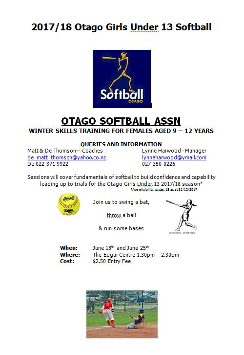 - Sessions will cover fundamentals of softball to build confidence and capability leading up to trials for the Otago Girls Under 13 2017/18 season.