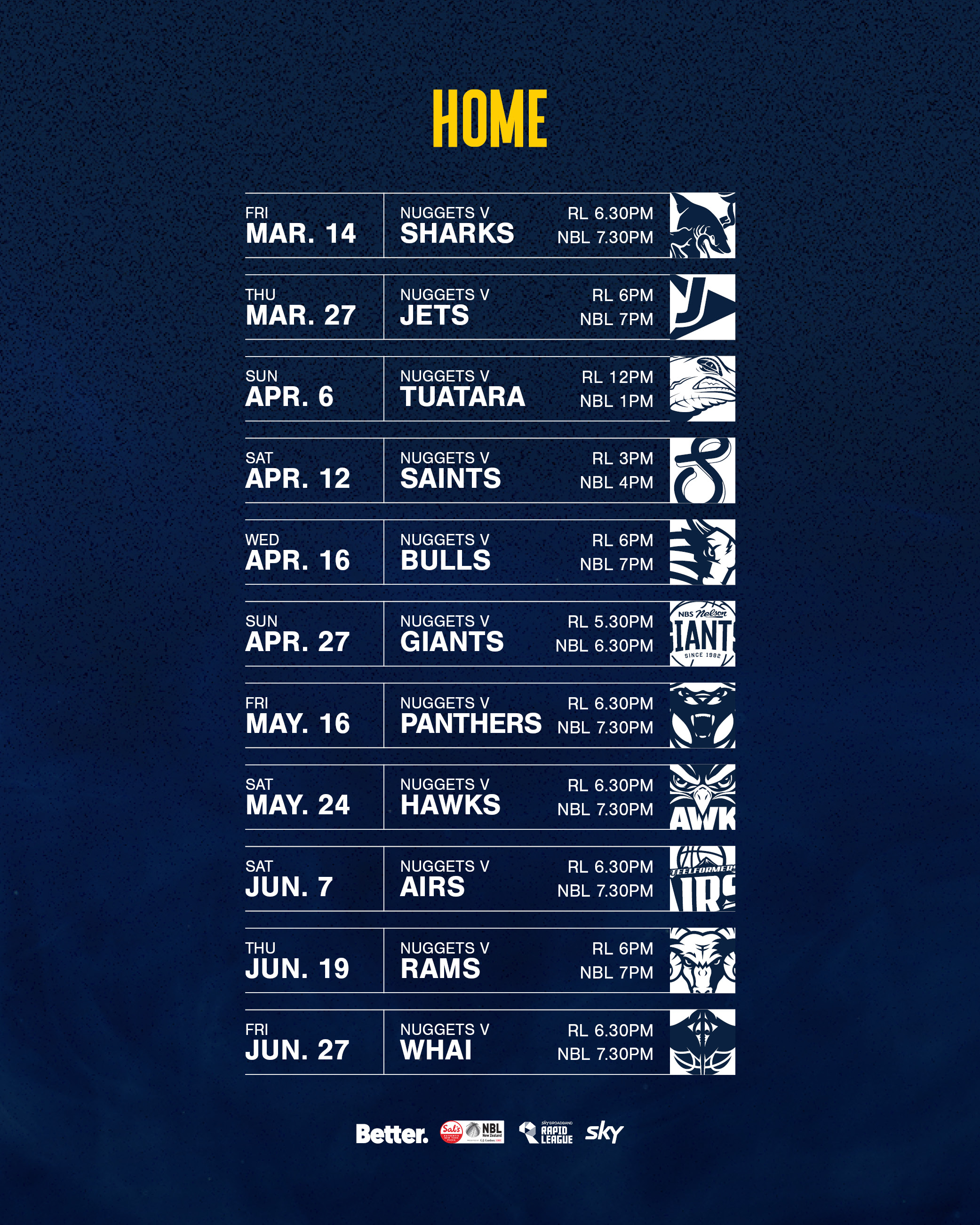 The Otago Nuggets are a professional Men’s basketball team based in Dunedin, and we have 11 home games at the Edgar Centre this season (see poster attached).