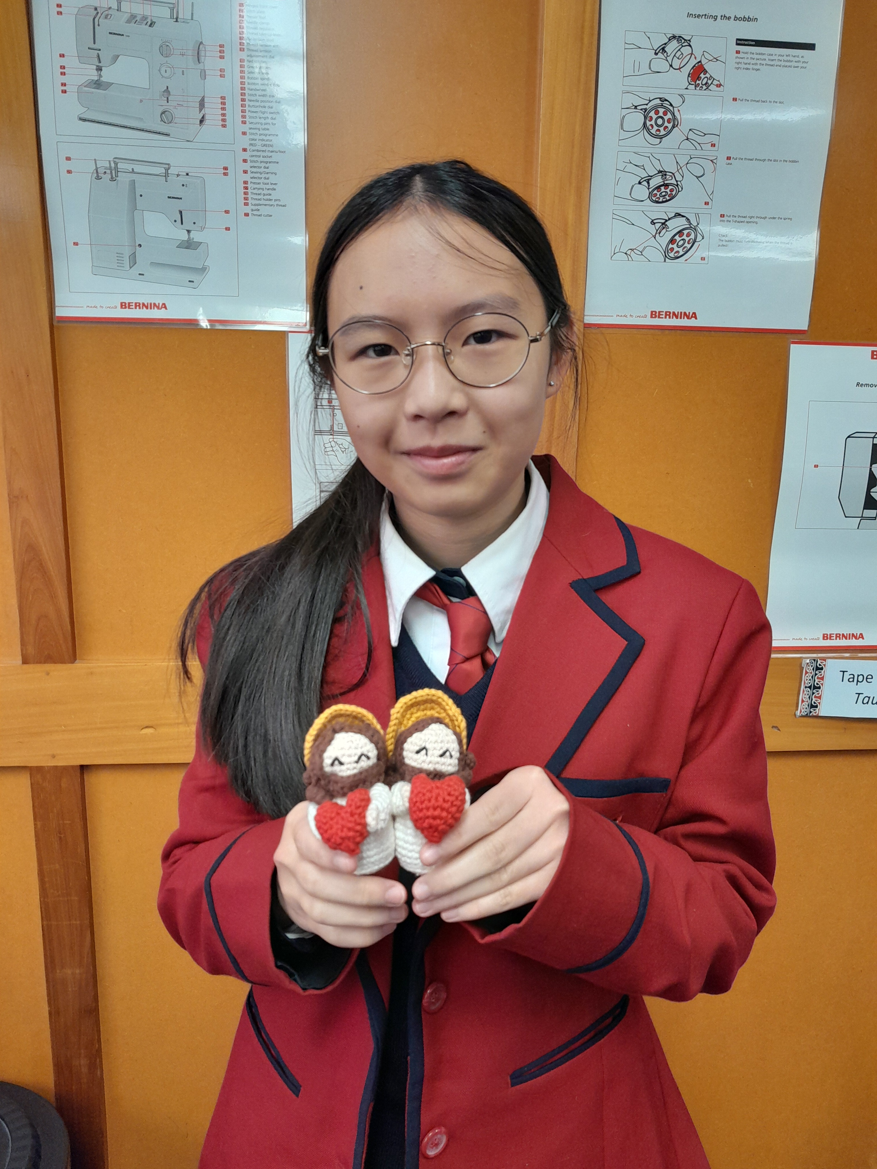 Megumi Toh, a Level 1 Textiles student, has recently finished crocheting these palm-sized representations of the 'Most Sacred Heart of Jesus.' As part of her involvement in the Duke of Edinburgh Award program in Crafts, Megumi was pleased to contribute to this project for Father Hook. Her skills are truly commendable!