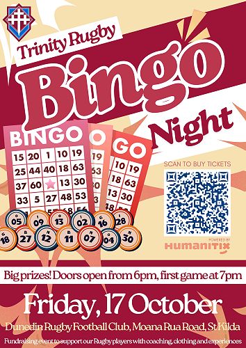 Trinity Rugby is running a Bingo Night on Friday, 17 October at the Dunedin Rugby Club and we need your support. Funds raised at this event will subsidise clothing, equipment and planned trips in 2026. Doors open 6pm, first call at 7pm.