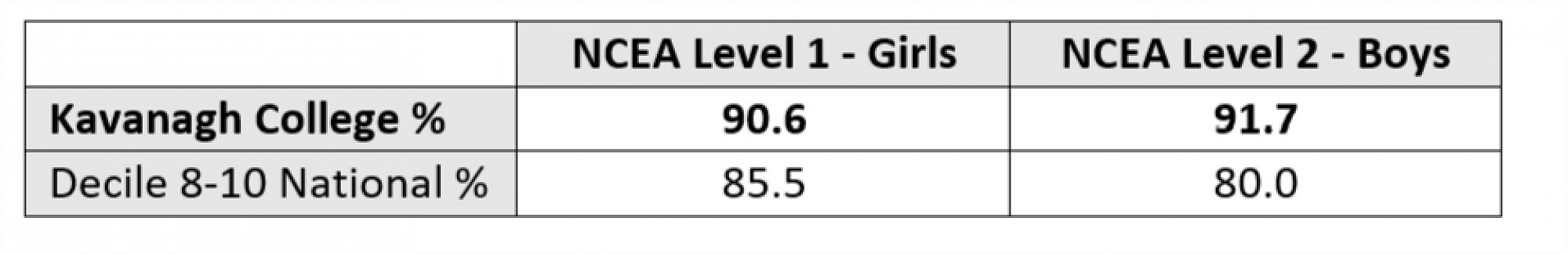 We are pleased to let you know that despite the difficult year that Kavanagh College staff and students experienced in 2019, our students again produced results significantly better than national data in all areas, and at a level higher than comparable schools (Decile 8-10 schools nationally) in Levels 1 and 2 and in University Entrance. Yet again, our excellence endorsements across NCEA Levels 1, 2 and 3 were outstanding and well above those of similar schools. Some of our highlights can be seen below.